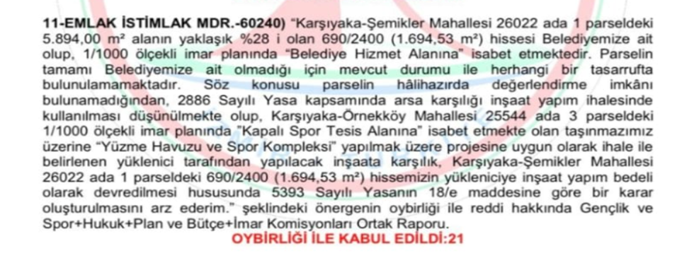 Karşıyaka Belediyesinin bu arsadaki payı 1.694/5.894 kadardır. Yani, arsanın 1.694 m2’lik bölümü Karşıyaka Belediyesi’ne aittir.