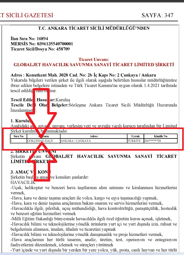 kiraya veren şirket GLOBALJET HAVACILIK SAVUNMA SAN. TİC. LTD. ŞTİ. (Ankara’da kurulmuş)