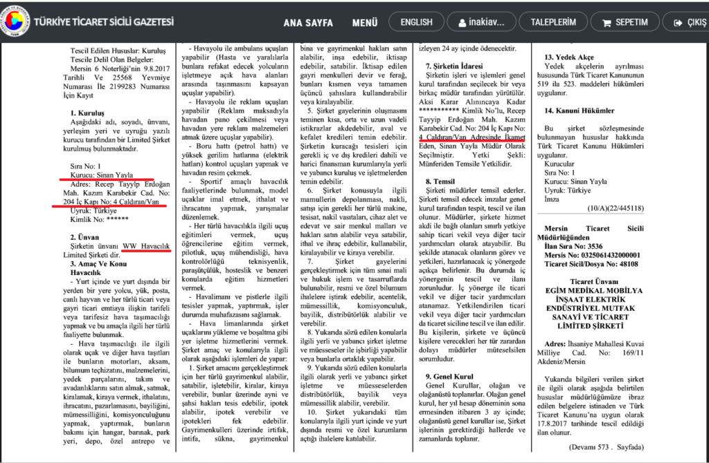 Jeti kiralayan şirket WW HAVACILIK LTD. ŞTİ. ise Mersin orijinli bir şirket. Mersin’de kurulmuştur. İlginç olan husus ise kayıtlara göre sahibi olarak görünen Sinan Yayla, Çaldıran/Van’da ikamet ediyor
