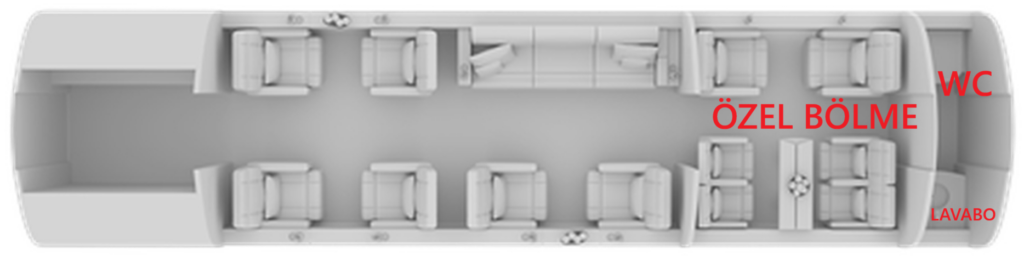 Bu uçak maksimum 15 yolcu kapasitelidir. Uçağın kıç bölümünde özel bir bölme var gibi duruyor. Özel bölmeden sonra da wc ve lavabo olduğu aşağıdaki fotoğraf incelendiğinde rahatlıkla görülebilmektedir.
