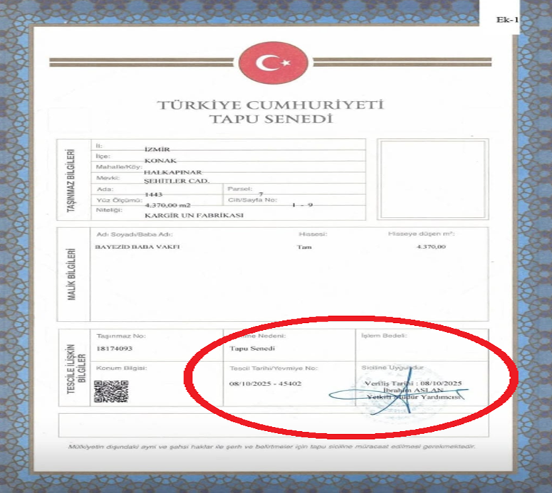 Ortada iki adet tapu senedi vardır. 8.10.2025 tarihinde düzenlenmiş olan tapu senedinde malik “Beyazid Baba Vakfı” olarak gösterilmiştir.